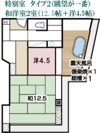 | どなたにも観音温泉をお楽しみいただきたいとの願いから、バリアフリーのお部屋もご用意しました。 ※全室露天風呂付(総檜風呂10室・信楽焼風呂8室)・トイレ(ウォシュレット)付・冷蔵庫完備 |
