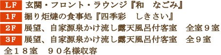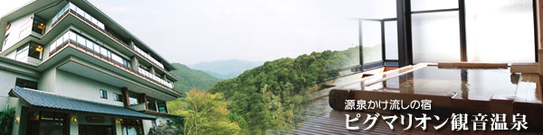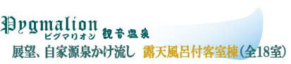 | 露天風呂付新館「ピグマリオン観音温泉」は全室が眺望のよいお部屋から続く極上の湯質の露天風呂付き。 伊豆奥下田の自然に抱かれ、山あいの四季の移り変わりや風を肌で感じながら、至福のときをお過ごし下さい。 |